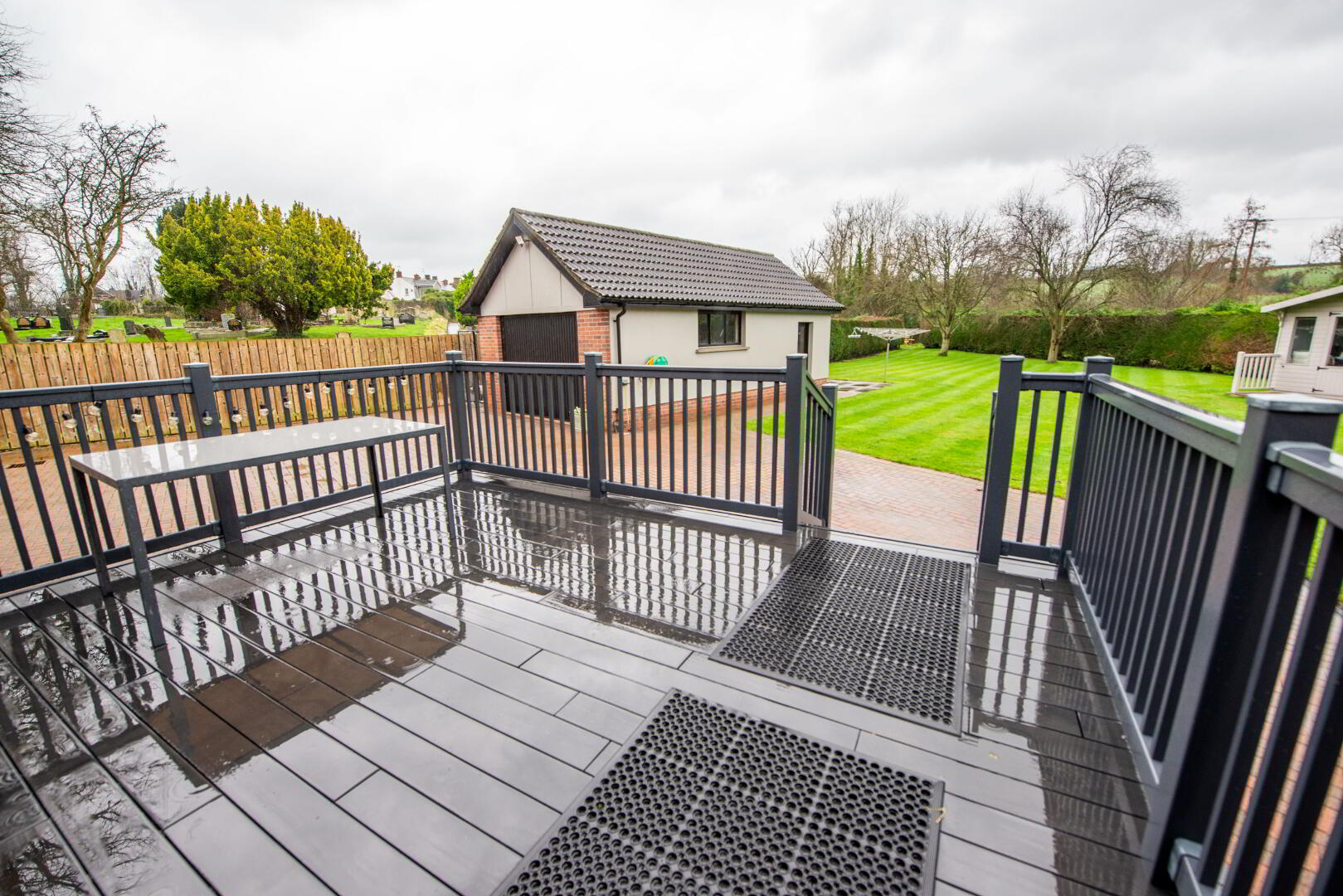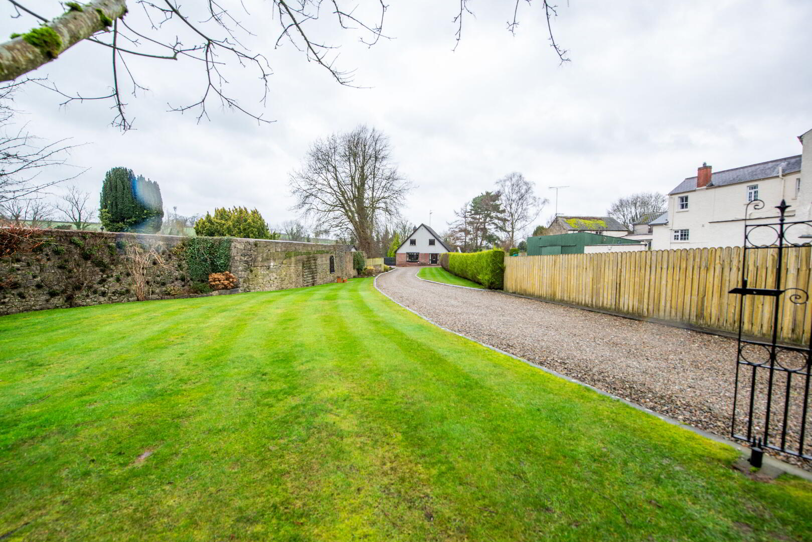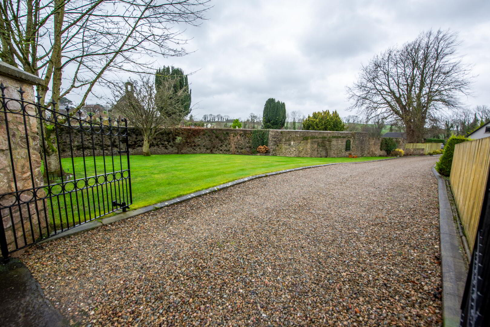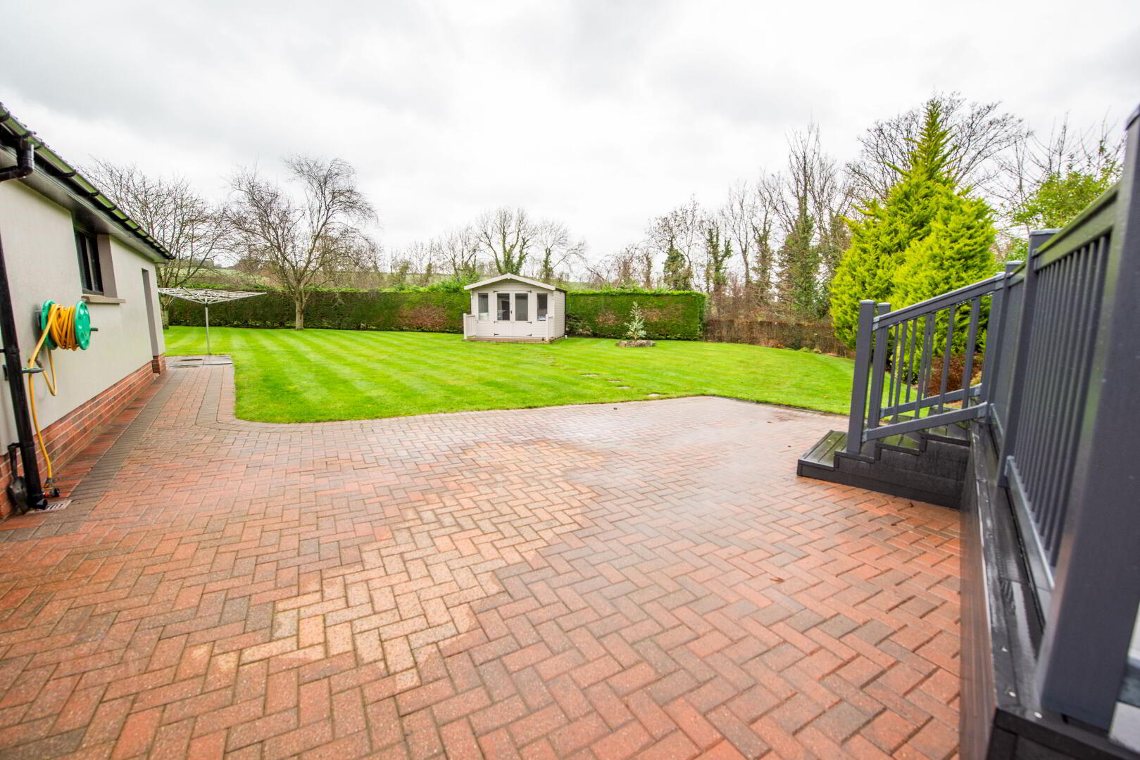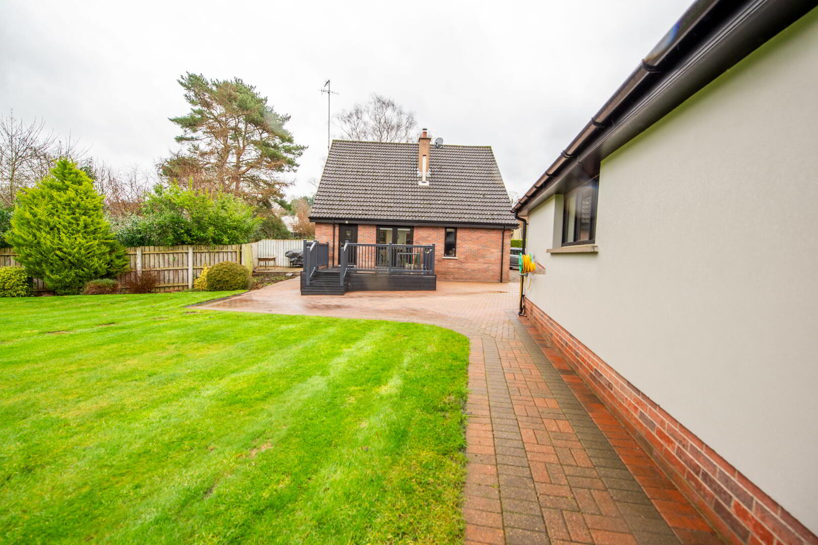 OUTSIDE A fabulous secluded site of approx half an acre laid mainly in lawn . Extensive driveway and parking area . Raised decking area . Detached garage ( 21'4" x 12'9" ) . Insulated summer house with electricity is included .