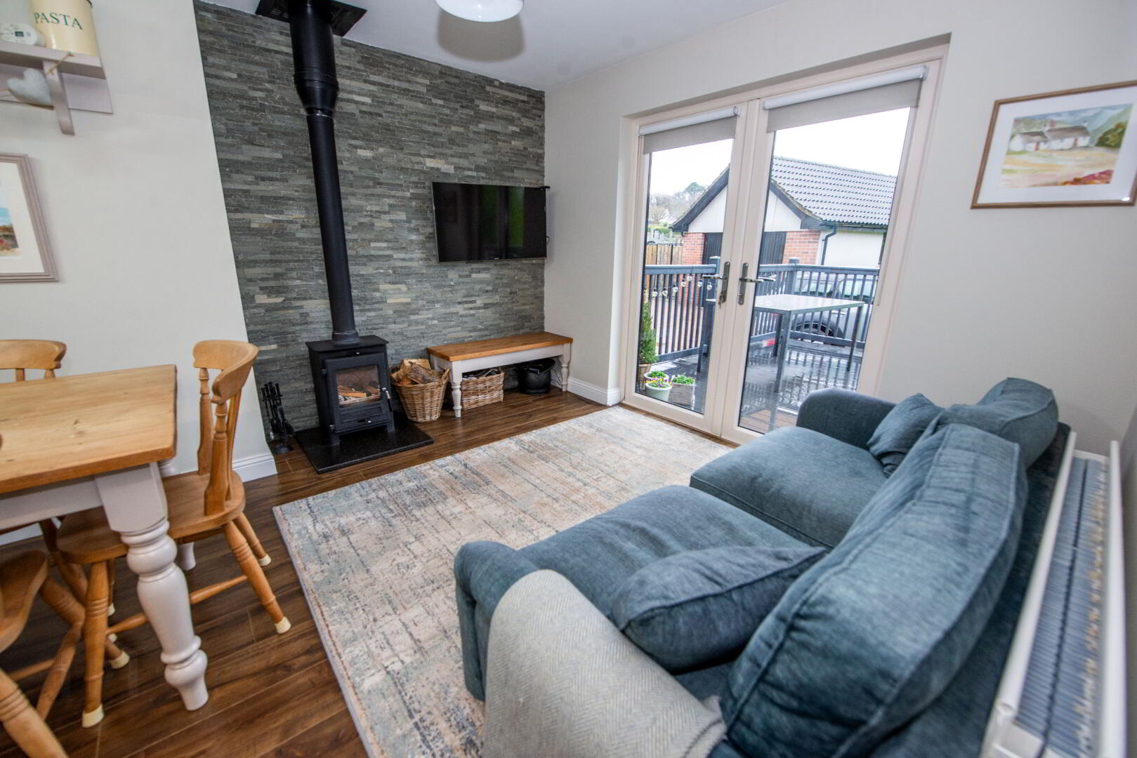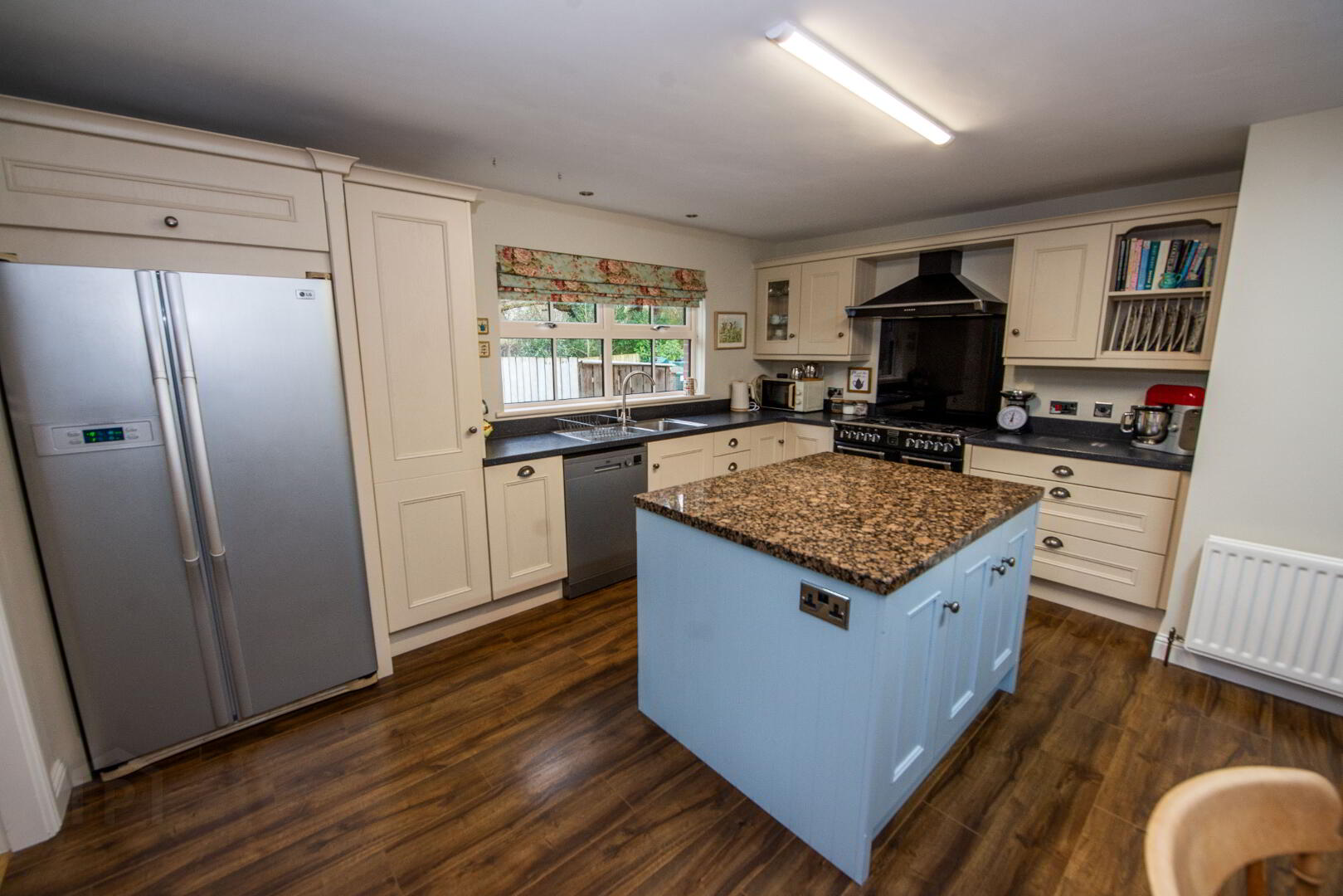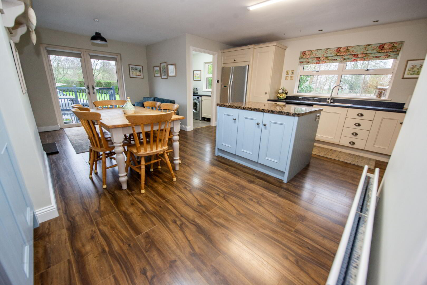KITCHEN/LIVING/DINING 20'0" X 17'0" A beautifully spacious open plan living area . High and low level units plus larder unit and central island . Range style cooker . Built in extractor fan .American fridge . Plumbed for dishwasher . Laminate floor .Glass fronted wood burning stove in living area . 2 Double panel radiators . Power points . PVC French doors to decking area and garden.