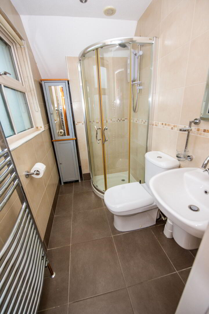 EN-SUITE Walk in shower , wash hand basin and w.c. Tiled walls . Tiled floor . Heated towel rail