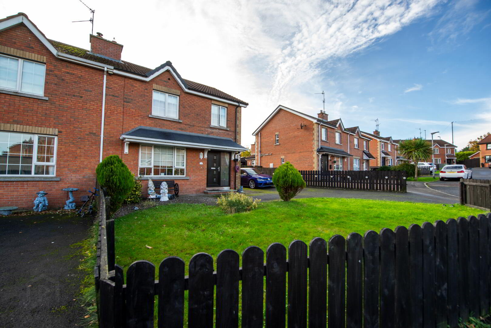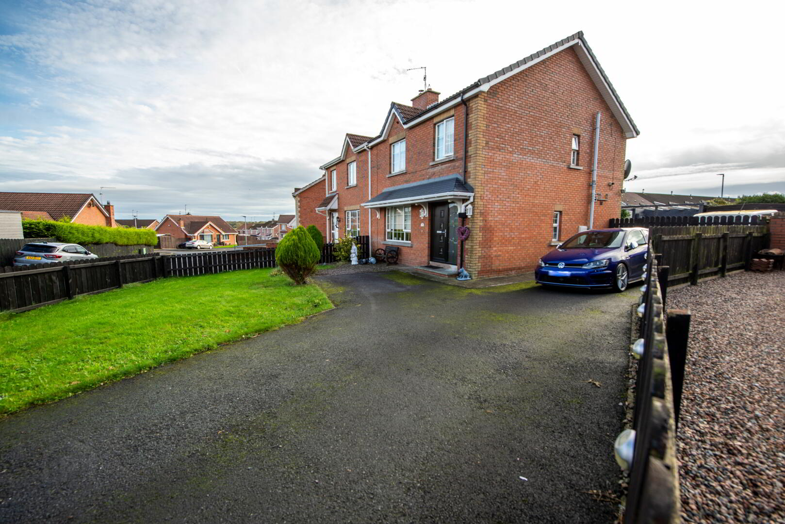 OUTSIDE Front garden in lawn Extensive tarmac driveway and parking . Rear garden in lawn,patio and decking.Garden shed included