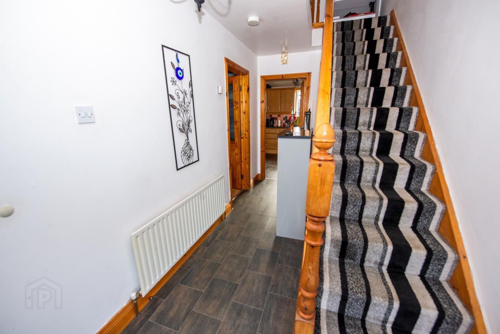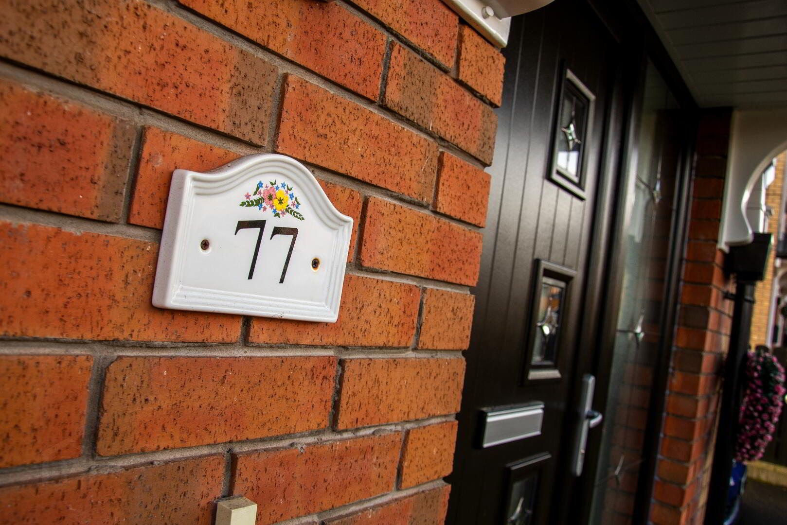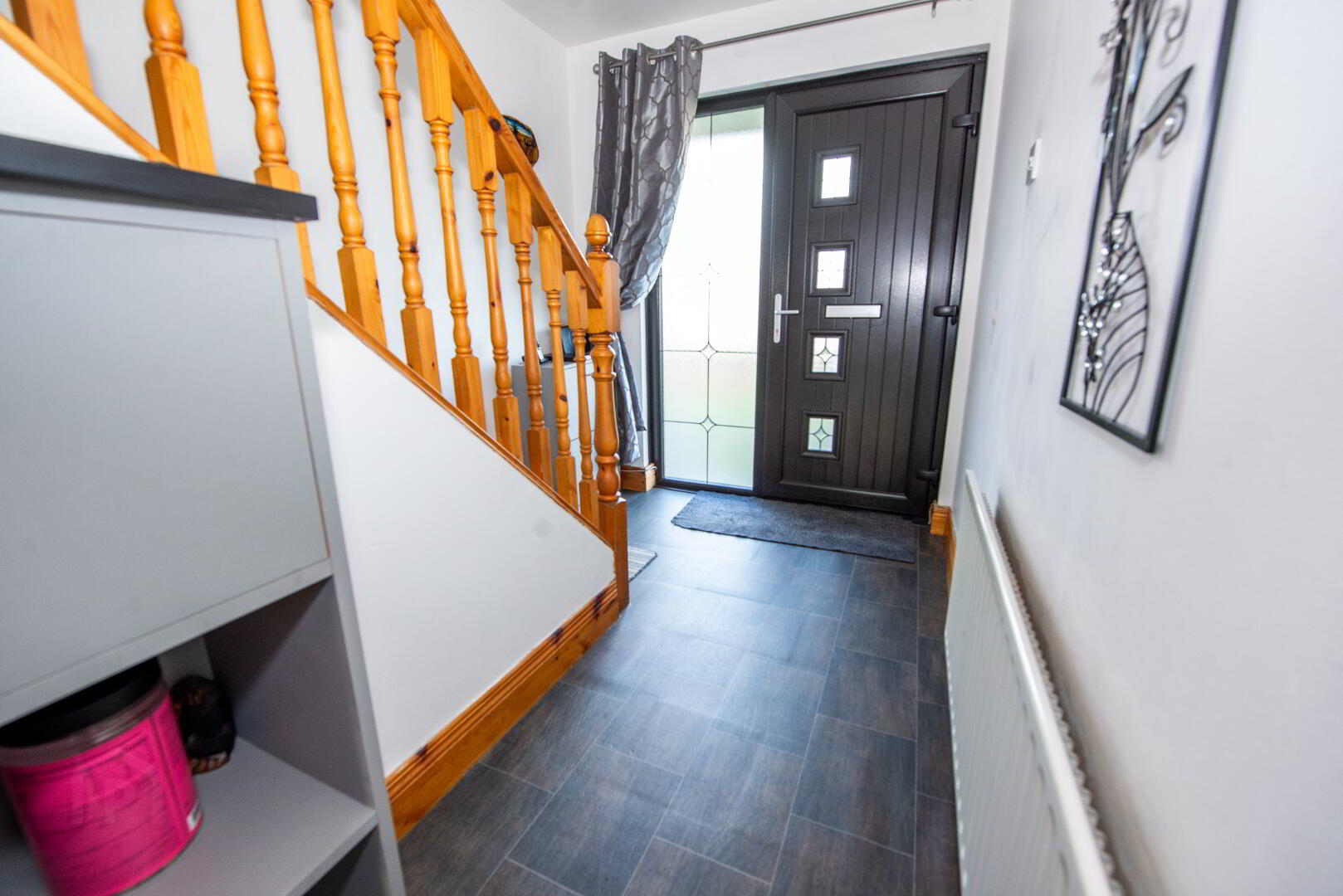 HALLWAY Composite front door with frosted glass side panel. Single panel radiator . Power Points . Built in cloakroom