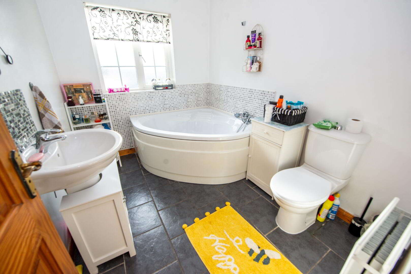 BATHROOM Corner bath with telephone shower attachment , wash hand basin and w.c. Tiled floor . Partially tiled walls . Double panel radiator