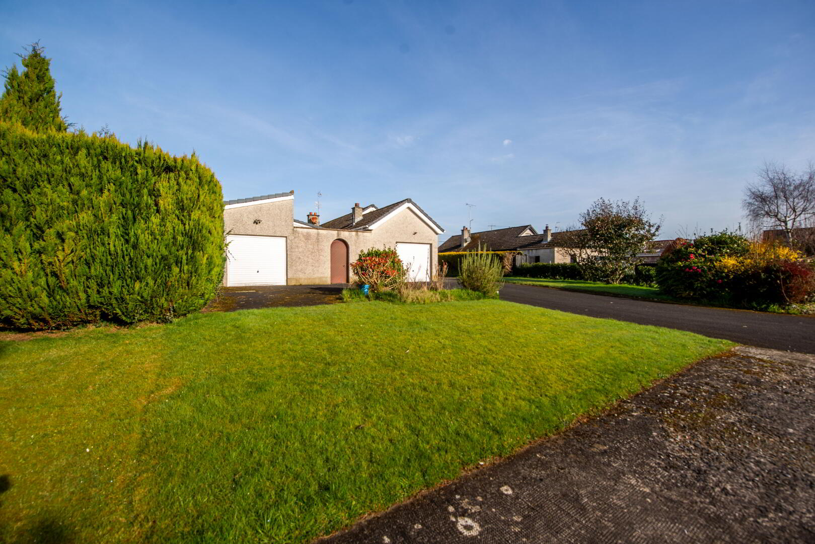 OUTSIDE 2 single car garages with up and over doors . Enclosed yard with boiler house , store and outside w.c. Front garden in lawn and shrubs . Back garden in lawn and spacious patio area . Extensive tarmac driveway and additional parking. View to the rear over an open field.