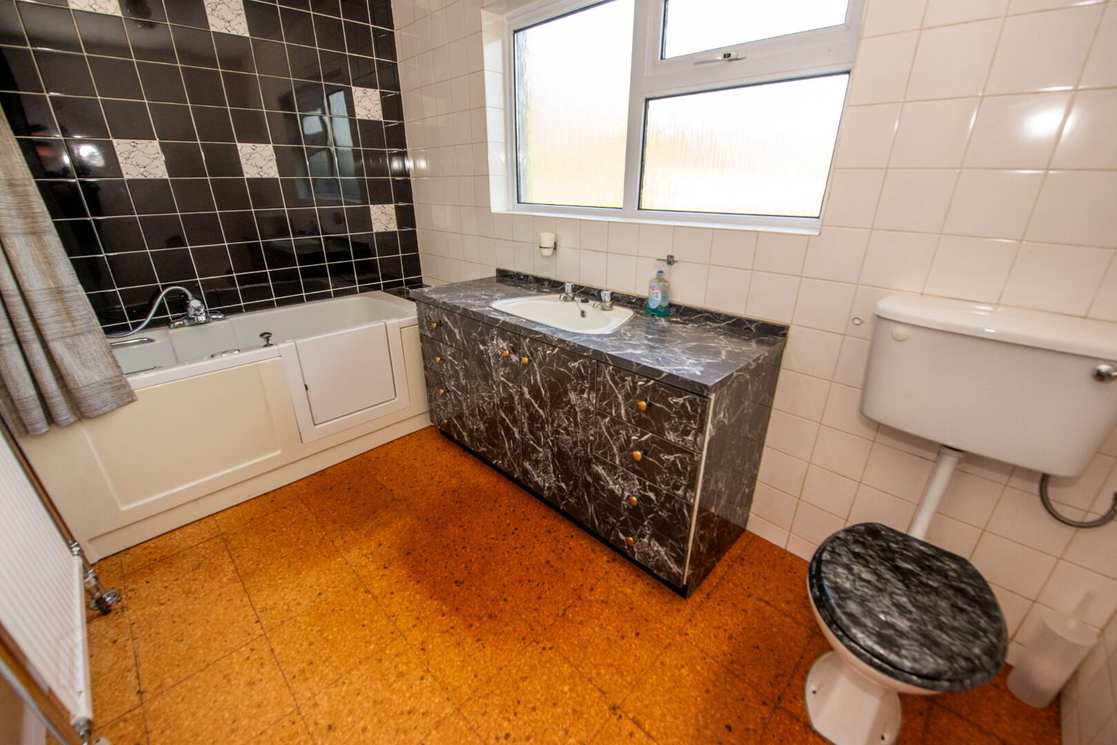 BATHROOM Bath with wall mounted shower , wash hand basin and w.c. Tiled walls