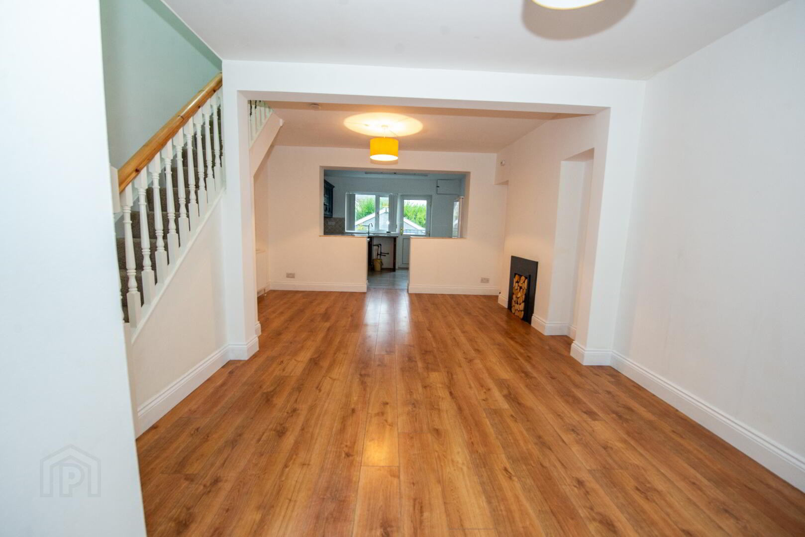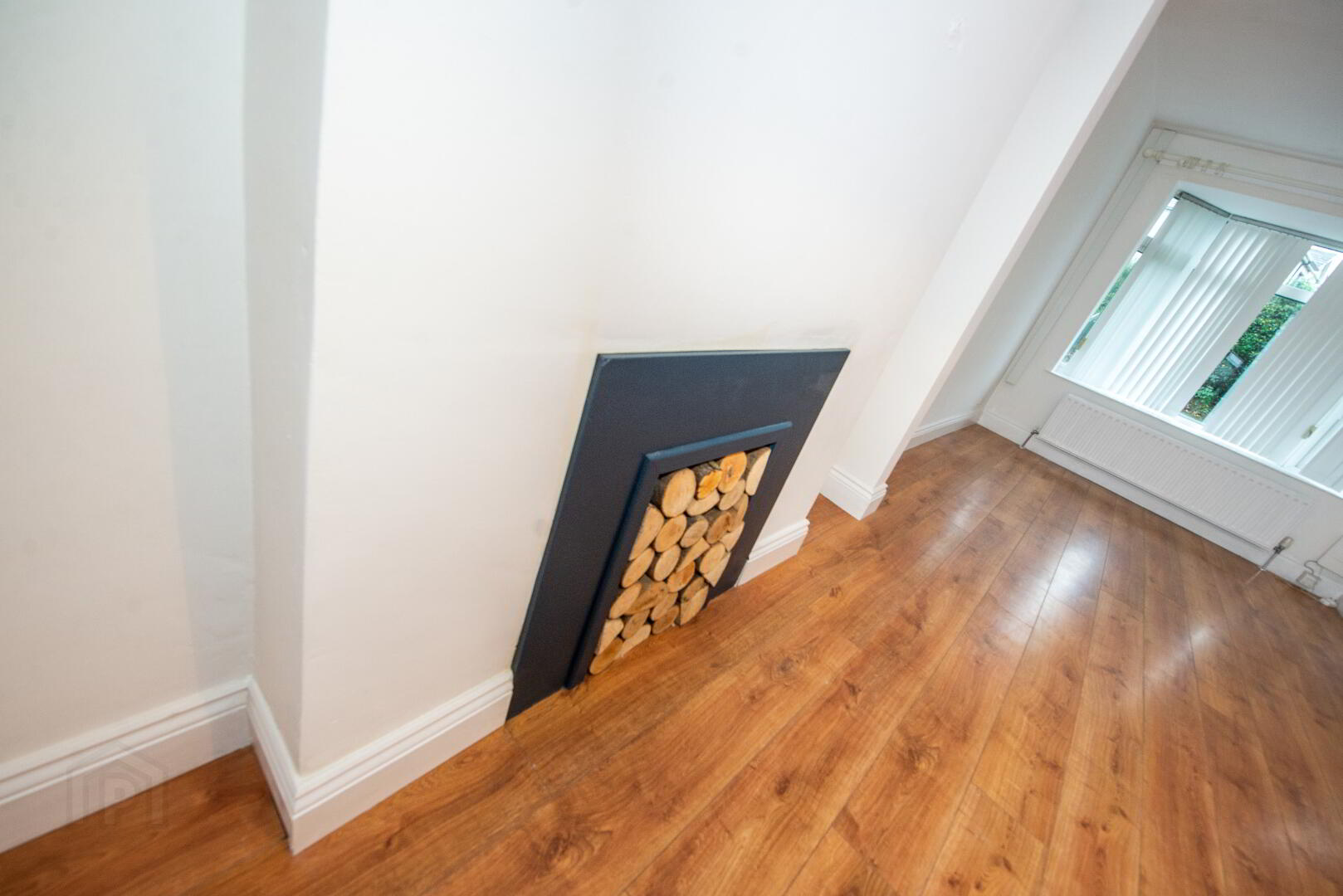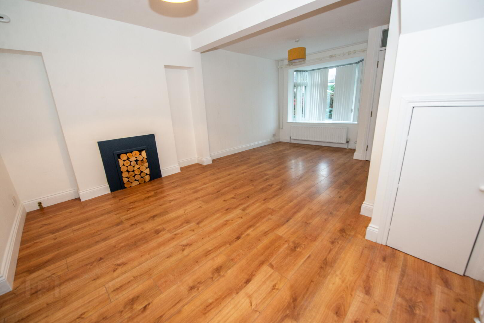 LOUNGE/DINING 19'5" X 12'7" ( max ) Hole in the wall style fireplace . Bay window . Understair storage . 2 Double panel radiators . Laminate floor . Power points