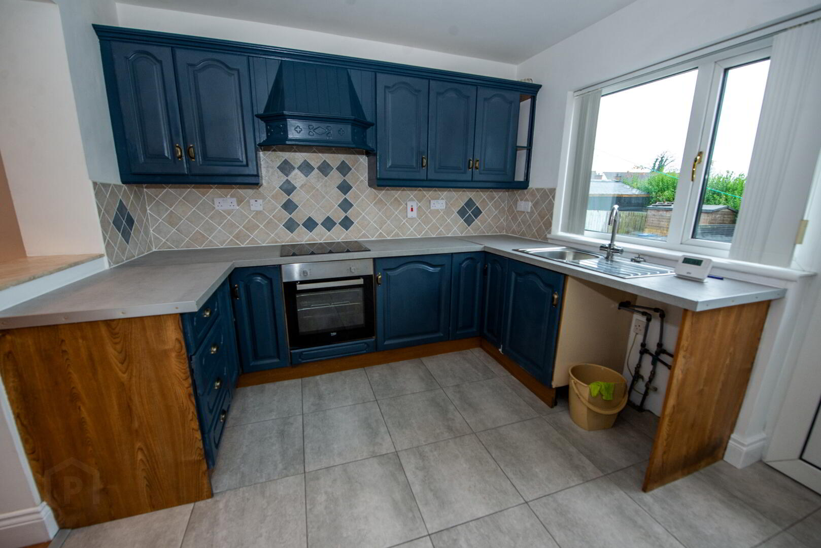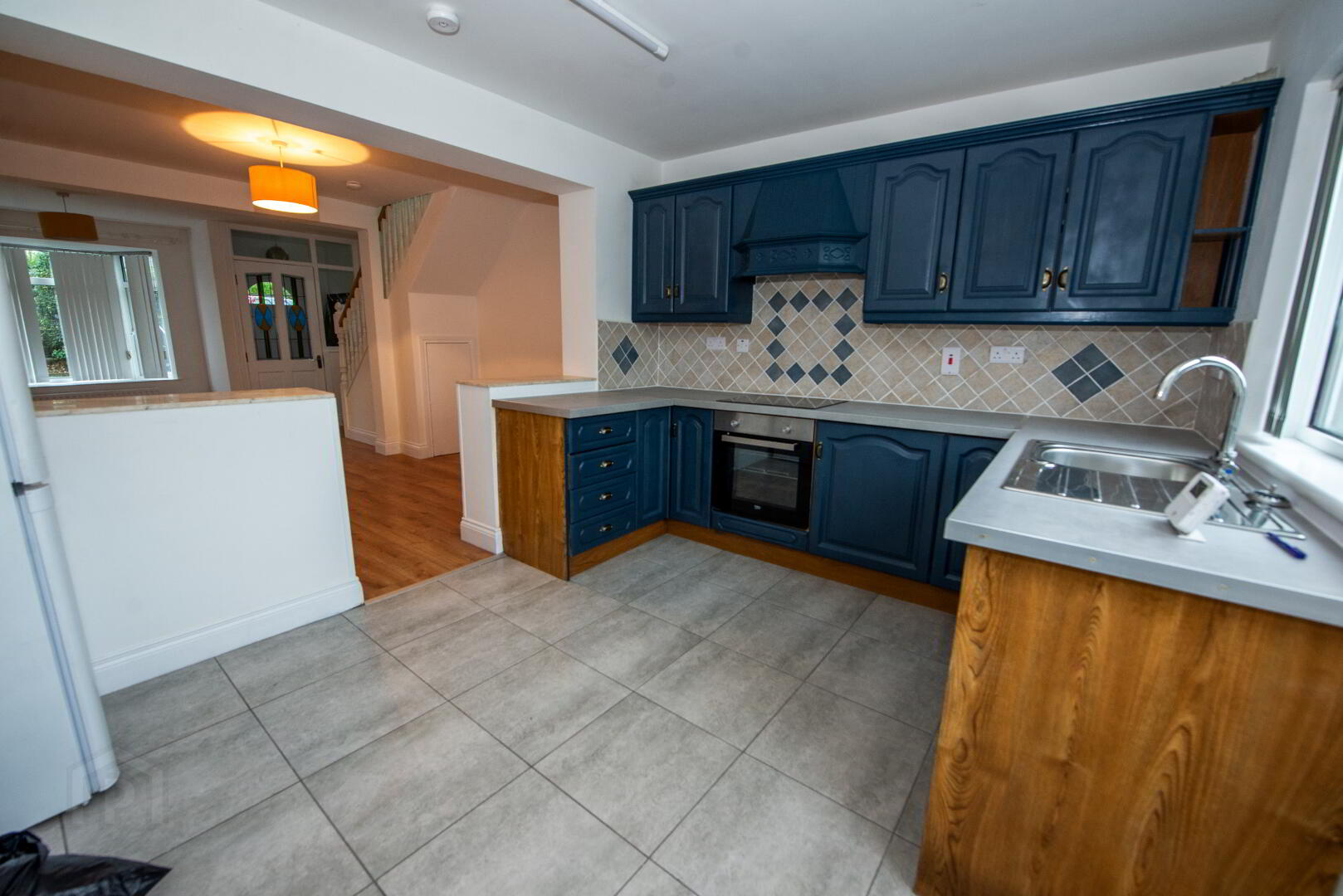 KITCHEN 12'0" X 10'2" High and low level units . Built in oven , hob & extractor fan . Plumbed for washing machine . Single drainer sink unit . Tiled floor . Partially tiled walls . PVC back door