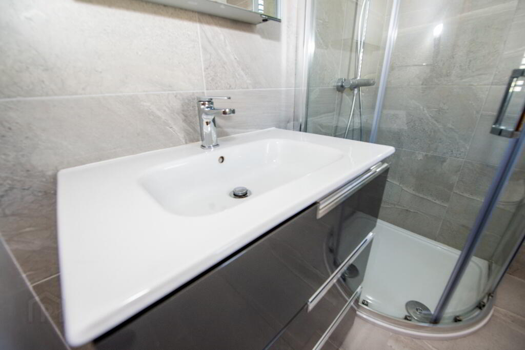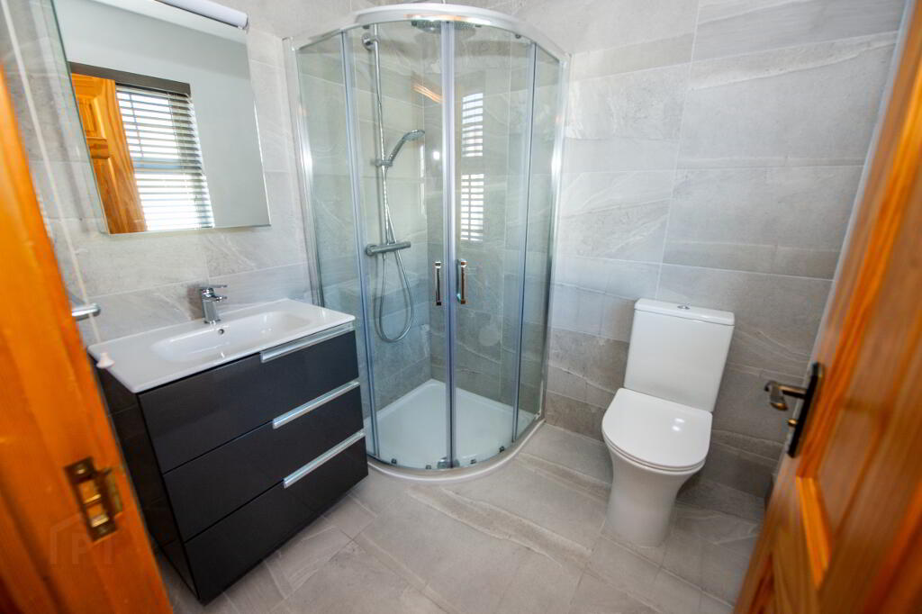EN-SUITE Walk in shower , vanity unit and w.c. Tiled floor . Partially tiled walls . Single panel radiator