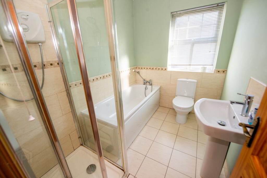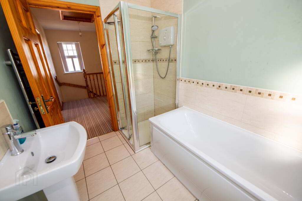 BATHROOM Panel bath , walk in shower , wash hand basin and w.c. Tiled floor . Partially tiled walls . Heated towel rail