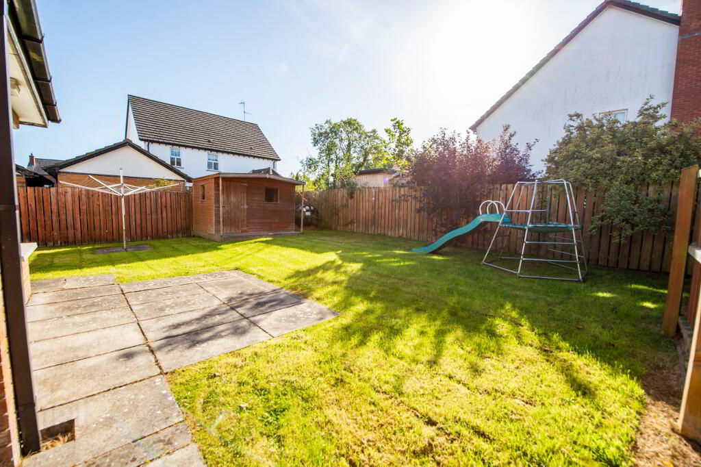 OUTSIDE Front garden in lawn . Enclosed back garden in lawn and patio .Garden Shed included .Tarmac driveway . Outside tap .