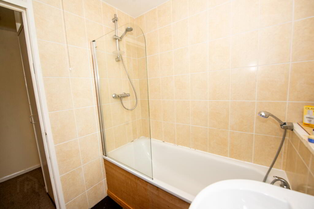 BATHROOM Panel bath with wall mounted shower unit ,wash hand basin and w.c. Partially tiled walls. Single panel radiator