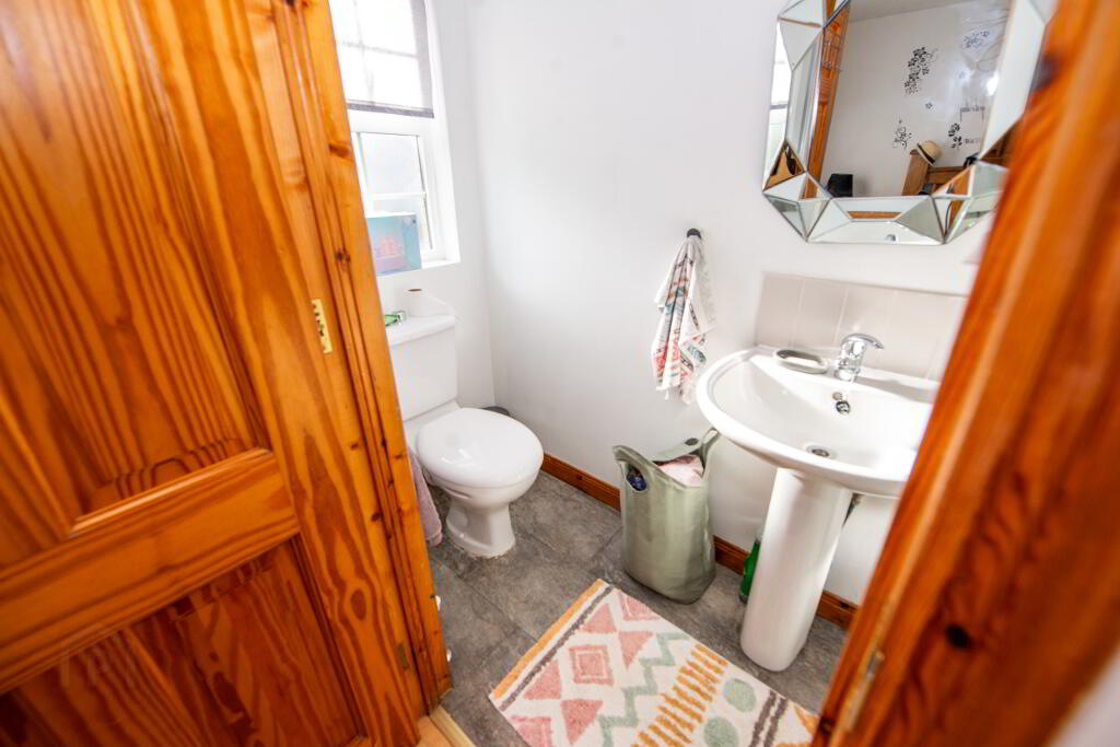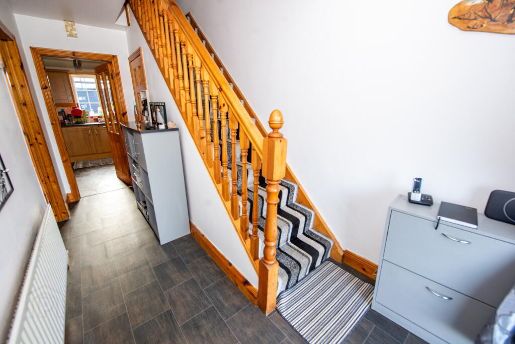 HALLWAY Composite front door with frosted glass side panel. Single panel radiator . Power Points . Built in cloakroom