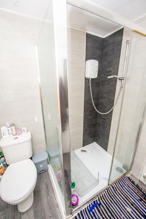 SHOWER ROOM Walk in shower , wash hand basin and w.c. Tiled walls . Single panel radiator