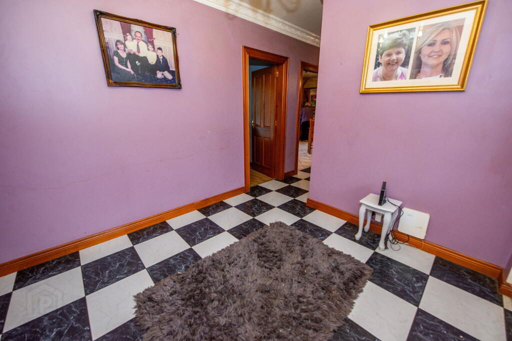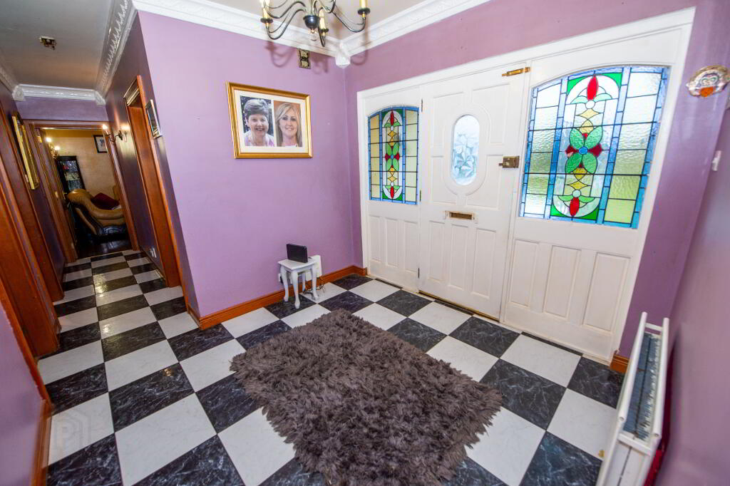 HALLWAY Glazed front door with stained glass side panels . Tiled floor . Cornice ceiling . Built in cloakroom and hot press . Double and Single panel radiators . Power points
