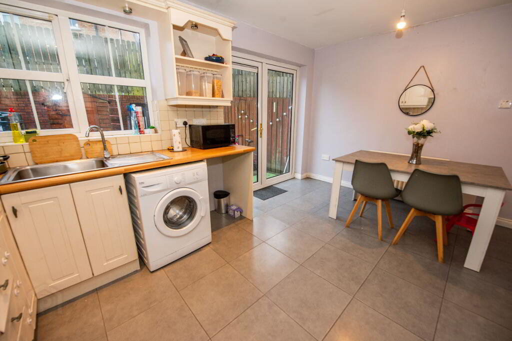 KITCHEN/DINING 14'8" X 10'6" High and low level units . Built in oven and gas hob . Built in extractor fan . Understair cloakroom . Plumbed for washing machine . Single drainer sink unit . Tiled floor . Partially tiled walls . PVC French doors to rear garden .