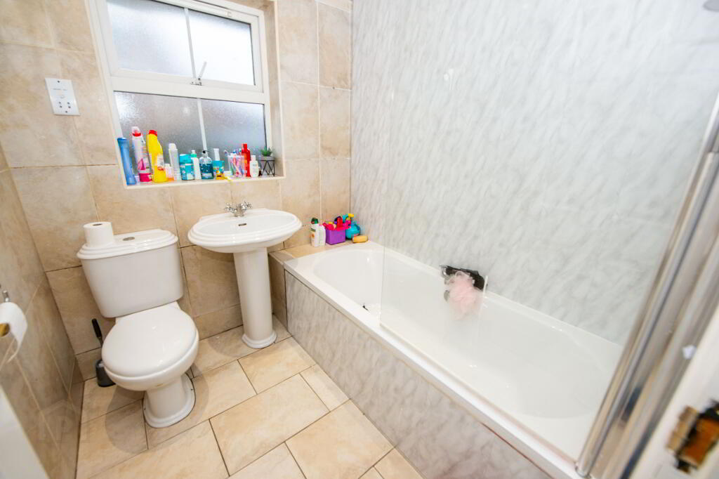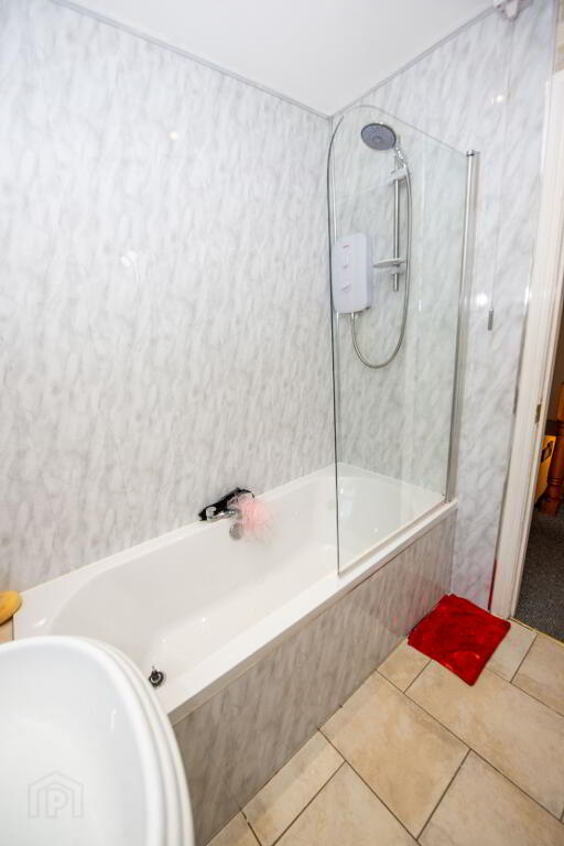 BATHROOM Panel bath with wall mounted shower ,wash hand basin and w.c. Tiled floor .Tiled walls. Single panel radiator .
