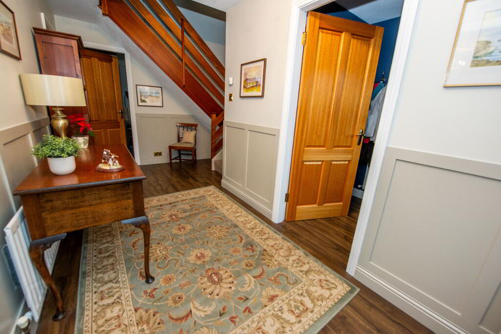 HALLWAY Glazed front door.Laminate floor .Feature half panelled walls . Double panel radiator. Power points