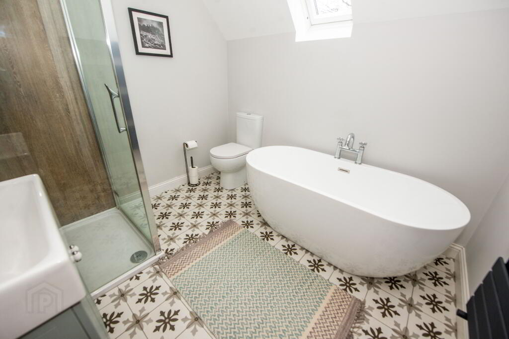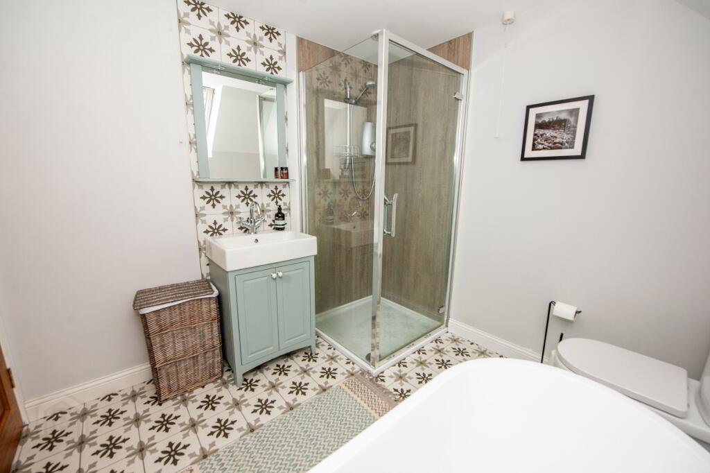 BATHROOM Free standing bath , walk in shower , wash hand basin and w.c. Tiled floor . Heated towel rail